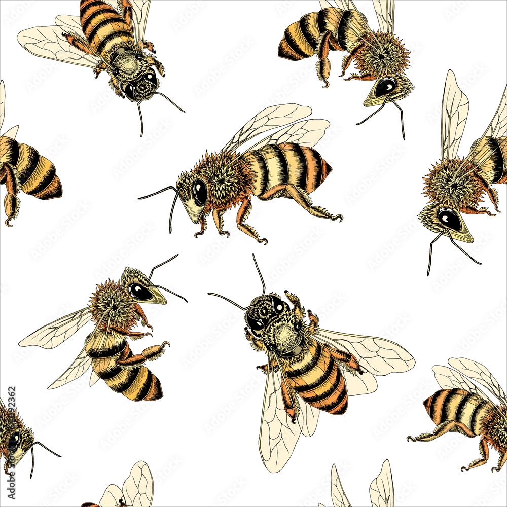 Bee Seamless Pattern In Honey Spectrum Color Vector Illustration Of Sketched Bees From Various Angles In Detail Stock Vector Adobe Stock